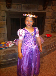 Princess Rapunzel. She got a cool new braided hair piece. She likes it! She thinks this costume is "itchy"--she's SO my child.